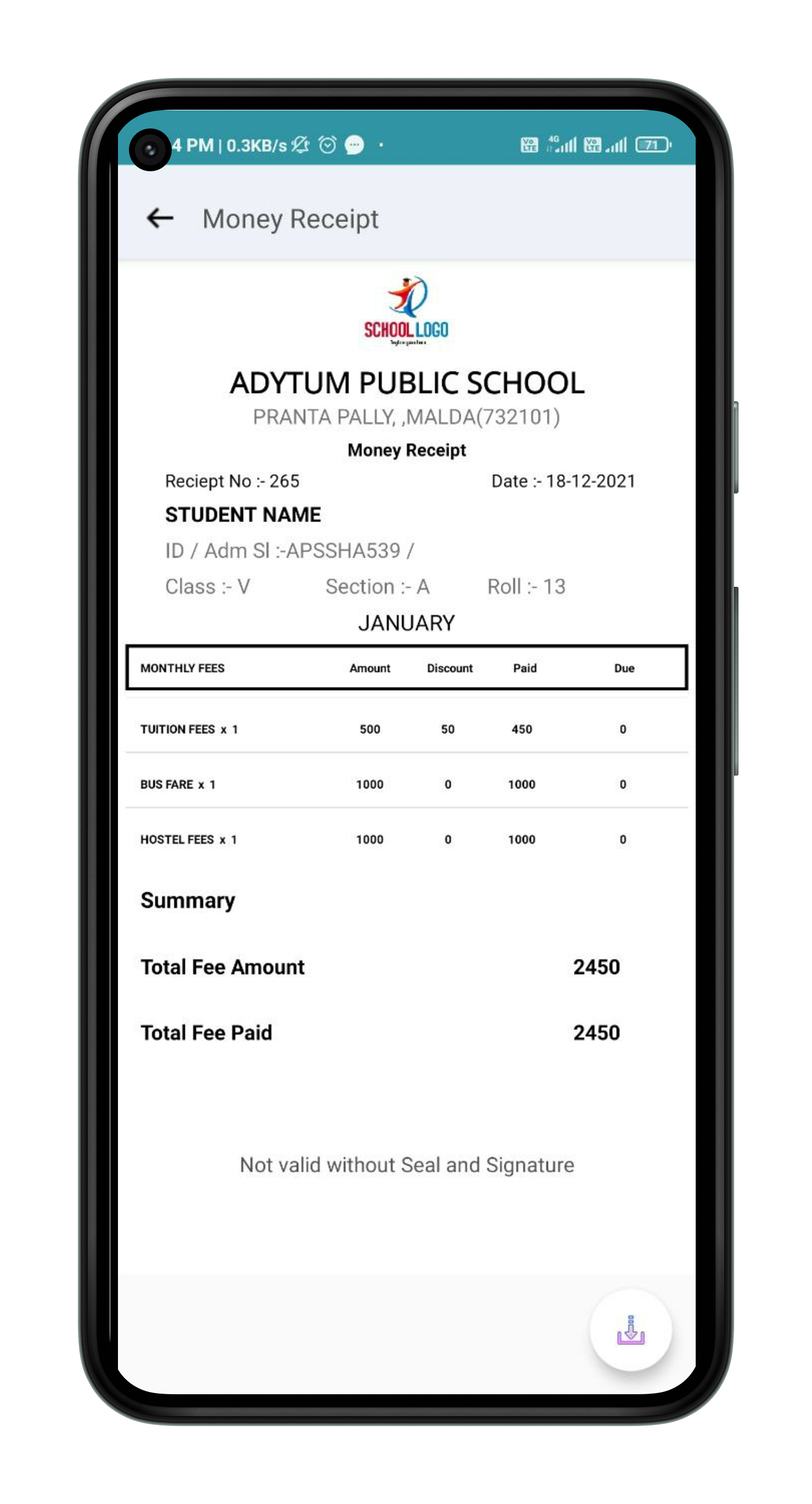 School also provides digital results to his/her parents through a progati app.
